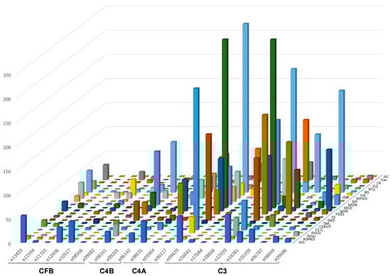 When investigating the excretion of the most abundant peptide of C3 (LQGTPVAQMTEDAVDAERLKHL) in different diseases after normalization of individual excretion values to the median abundance of healthy controls (Figure 2), the highest relative levels were documented in MCD, FSGS, IgAN and LN, entities with known involvement of complement activation in the pathophysiology of the diseases. As evident especially in Figure 4, high levels of specific complement C3 peptides are detectable in MGN. This intense excretion of specific complement peptides in MGN may seem surprising and for a long time the disease has not been associated with increased complement activity. Nevertheless, evidence by now suggests that the complement system plays an important role in MGN [30], even though the complement pathways in MGN remain unexplored to some extent. Proteome analyses of kidney tissue samples from patients with MGN also showed significant complement activation and evidence of complement peptides from C3 and C4-related pathways [31]. Urinary excretion of complement activation products (sC5b-9, C3d) has been shown to correlate with disease activity [32,33,34].