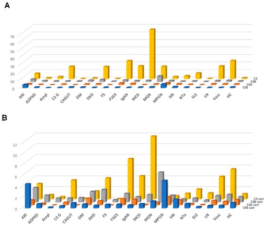 Correction for proteinuria calculated based on the change in “combined abundance” was applied for each peptide from each patient, and the distribution in the subjects where proteinuria was available was investigated in the different CKD etiology/condition, with and without correction for proteinuria. The results are presented in Figure 4. In the case of C3 fragments after adjustment for proteinuria, highest excretion was seen in MCD, C3G, DKD, FSGS, MGN, LN and vasculitis. For CFB fragments corrected for proteinuria, high excretion was seen e.g., in acute kidney injury and MPGN.