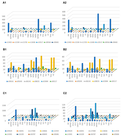 The urinary excretion of all detected complement fragments stratified by disease etiology/condition is shown in Figure 2. Due to the complexity of the data matrix depicting the abundance of 23 peptides in 22 diseases/conditions, not all data points can be visualized in the Figure 2. To enable detailed inspection, all underlying data are also presented in Supplementary Table S1. Shown are individual peptide excretion levels normalized to healthy controls. This was calculated by division of mean abundances per disease/condition with the mean corresponding abundance in healthy controls. Highest relative levels (in reference to healthy controls) for LQGTPVAQMTEDAVDAERLKHL (e12939, complement C3) excretion were seen in minimal change disease (MCD), followed by nephrotic syndrome (NS), focal segmental glomerulosclerosis (FSGS), MGN, LN, diabetic kidney disease (DKD), IgAN, MPGN and C3G.