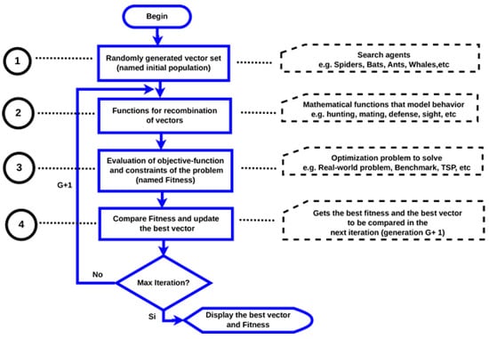 Currently, meta-heuristic algorithms are widely used as one of the main techniques to obtain an optimal solution (near to optimal) in various complex problems in several engineering and scientific research areas. Practically, it is possible to use them to solve any linear or non-linear optimization problem through one or several objective functions subject to several intrinsic restrictions. For example, they are quite useful in solving very complex problems where deterministic algorithms get caught up in a local optimum. Nowadays, meta-heuristics have become effective alternatives for solving NP-hard problems due to their versatility to find several local solutions, as in real-world applications, e.g., optimal design of structural engineering problems [,], logistics and industrial manufacture [], renewable energy systems [], Deep Neural Networks (DNNs) models optimization [], among other applications. Metaheuristics generate several search agents, through stochastic processes within the solution space to find the optimal or close to the optimal value. The goal is to achieve efficient exploitation (intensification) and exploration (diversification) of the search space. Where, exploitation and exploration are associated with local and global search, respectively. In any metaheuristic design a fine balance of these search processes should be a desired objective. Metaheuristics are not perfect, one weakness is that the quality of the solution depends on the number of search agents and the stop condition of the algorithm, commonly determined by the number of iterations.