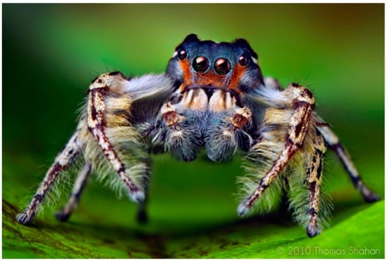 Jumping spiders Salticidae are found in a wide range of microhabitats []. Family Salticidae is the largest family of spiders; they are agile and dexterous jumpers of a few millimeters in length. They move at high speed and are capable of long and accurate jumps. They are generally active diurnal hunters and do not build webs. Their body appears to be covered with hairs that are both scaly, sometimes iridescent. The palps of males, but not females, are often large and showy, used during courtship. The front legs are somewhat larger and used to hold the prey when they fall on it. Thus, running and jumping on the prey are their primary hunting method. When they move from one side to the other and especially before jumping, they glue a silk thread where they are perched to protect themselves in case the jump fails. In that case, they climb back up the thread. The silk threads are impregnated with pheromones that play a role in reproductive and social—communication and possibly navigation. In addition, jumping spiders have complex eyes and acute vision. They are known for their bright colors and elaborate ornamentation, where males are generally brighter than females. Some species can remember and recognize colors and adapt their hunting style accordingly. Further details about the Jumping Spiders’ biology and locomotion behavior can be found in [,]. A photograph of the jumping spider can be seen in Figure 2.