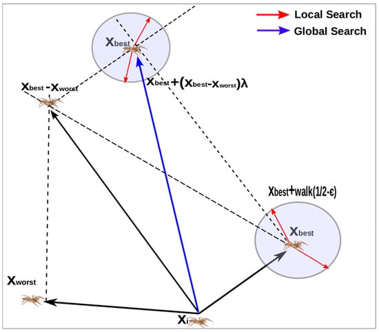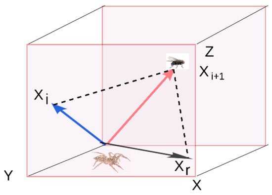 where is the new position of a search agent (jumping spider) for the generation g + 1, is the current ith search agent in generation g, and is the rth search agent randomly selected, with , where r is a random integer number generated in the interval from 1 to the size of a maximum of search agents. A representation of this strategy can be seen in Figure 3.