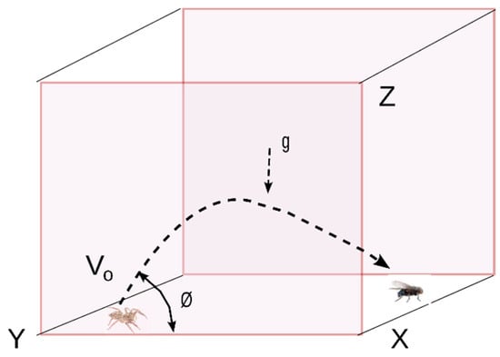 The jumping spider follows its prey and pounces on it. The hunting strategy of jumping on the prey can be represented as a projectile motion; see Figure 4.