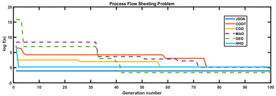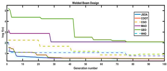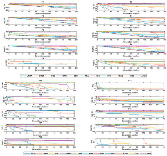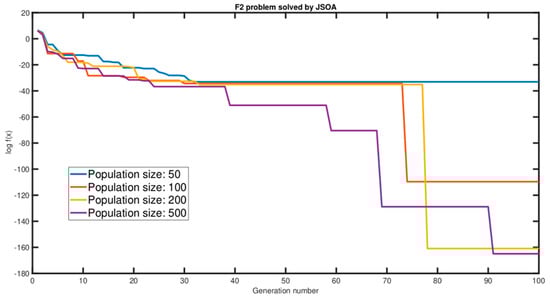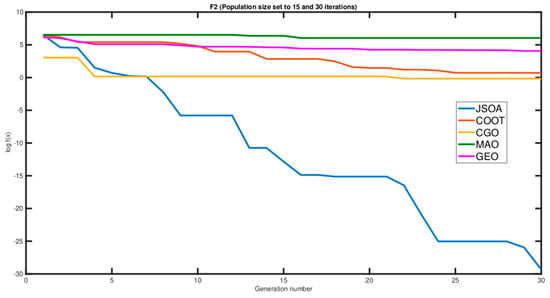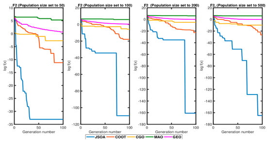 The effects of the population size on the performance of the JSOA algorithm are studied by fixing the number of iterations to 100 and then varying the population size initially at 50, then 100, 200, and 500 for the Griewank function (F2). The output of these tests is summarized in Figure 7, where a convergence graph is used to determine whether the measured quantity (fitness) converged acceptably. The results were graphically compared with the setup mentioned above. Whereas Figure 8 shows the JSOA algorithm compared with the four most recent bio-inspired algorithms from the first half-year of 2021, these are Coot Bird Algorithm (COOT) [], Chaos Game Optimization (CGO) [], Mexican Axolotl Optimization (MAO) [], and Golden Eagle Optimizer (GEO) [].