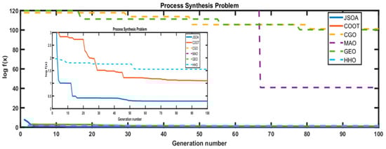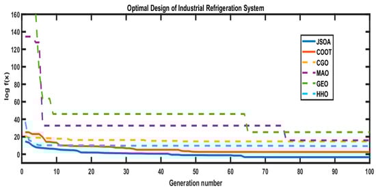 In all the carried out tests, the number of iterations was set at 200, this being a lower value than that commonly used in the literature (500 or 1000) [,,]. Therefore, the JSOA algorithm is more efficient in finding optimal (near-to optimal) solutions with a smaller number of iterations.