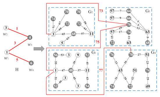 By recoloring the graph H and the graphs in the graphic base , we obtain the vertex color set of H-graph to be , the edge color set of the H-graph to be . Thereby, we claim that g is a set-ordered odd-graceful total coloring of graph . An example of the proof process of Theorem 1 is shown in Figure 2.