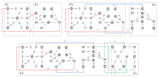 Obviously, is the vertex bipartition of the connected graph , where and . The edge or satisfies the above inequality conditions form a set , so that , we claim that is a set-ordered odd-graceful total coloring of . Next, let , then consider the total coloring of connected graph and graph . According to the above method, the edge set can be obtained, which is the set of all edges between and ; thereby, we can obtain a set-ordered odd-graceful total coloring of , in this way, the theorem is proven. An example of the proof process of Theorem 3 is shown in Figure 4.