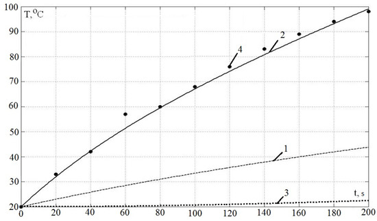 Comparison of calculation results and experiment. 1—primary winding average temperature (calculated); 2—secondary conductive plate average temperature (calculated); 3—primary core average temperature (calculated); 4—secondary conductive plate average temperature (experiment).