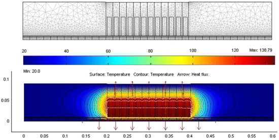 The primary of the traction single-sided LIM for the urban transportation system is shown in Figure 11. The LIM operates as a part of a variable speed drive. The main parameters of the LIM are given in Table 4. The design features of the LIM and the configuration of its cooling system were taken into account during calculation. Detailed results of the hydraulic calculation of the cooling system are given in [39] and were adopted for the current study.