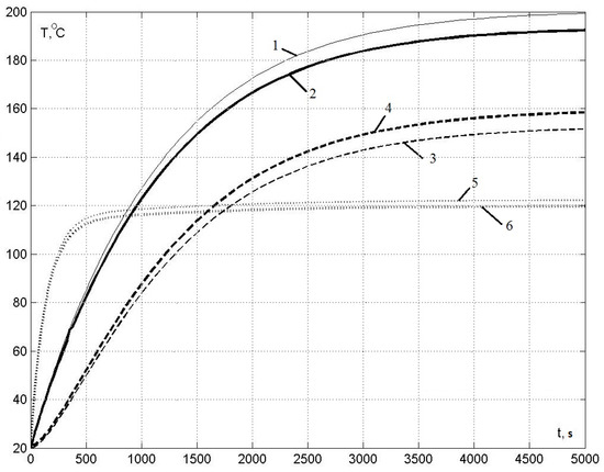 Comparison of calculation results with the FEM model. 1—primary winding average temperature; 2—primary winding average temperature (FEM); 3—primary magnetic core average temperature; 4—primary magnetic core average temperature (FEM); 5—secondary conductive plate average temperature; 6—secondary conductive plate average temperature (FEM).