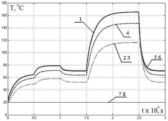 - Losses at the soft start are approximately 10% less than at the direct start. Accordingly, the heating of the stator windings becomes 8.1% less already at the time of the voltage ramp-up to the nominal value equal to 2 periods of the mains. The heating of the secondary surface layer becomes 13.5% less. A further increase in the voltage ramp-up time does not lead to a significant reduction in losses and, accordingly, heating. The calculation results of thermal processes for the case of soft start with forced cooling at a nominal cycle time are shown in Figure 15.
