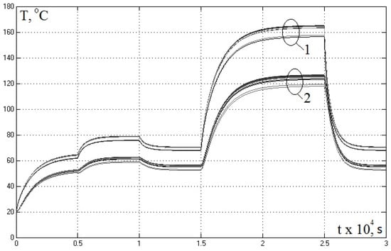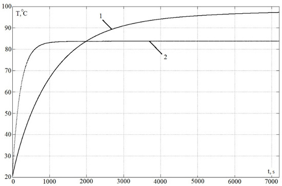Figure 15. Average temperatures of the arc LIM during soft start. 1—stator winding; 2—secondary surface layer.