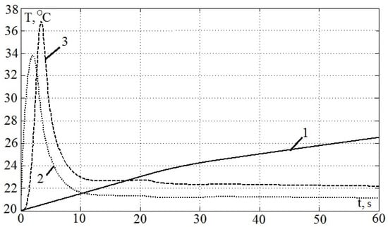During the experiments on this unit, the average temperature of the secondary conductive plate was determined. Figure 5 shows the calculation results and the experimental results at zero speed. The experimental value at time t = 60 s was excluded from further analysis. The maximum absolute error of the calculation does not exceed 2 °C; the maximum relative error does not exceed 3%. The root-mean-square (RMS) error is 1.2%.