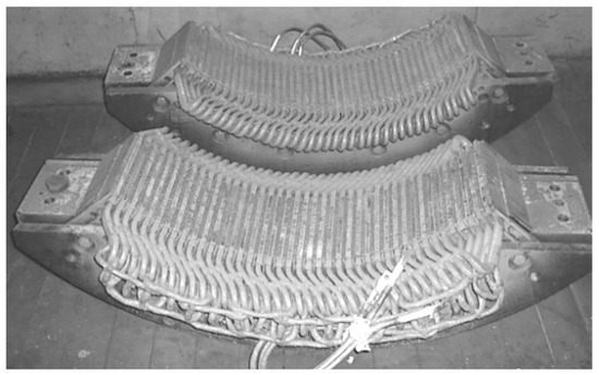 A comparison of the thermal processes calculation results of the LIM experimental unit (Figure 4) was performed with experimental data. The LIM consists of two primary cores in opposite slots of which ring coils are installed with phasing +A − C + B − A + C − B + A − C + B along the length. In the gap between the cores, there is an aluminum plate and solid back iron. The main parameters of the LIM are given in Table 2.