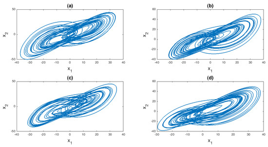 Figure 1 displays the 2D phase portraits of the new system (43) with the parameters (44) and three different initial conditions. Figure 2 displays the 2D phase portraits of the new system (43) with the parameters (44) and a different hyper–chaotic control parameter. As it turns out, the new system is sensitive to changes in the initial conditions.