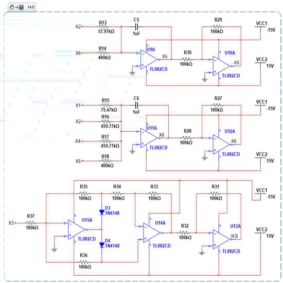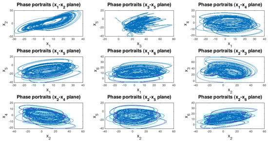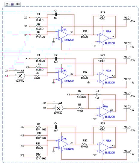 where x1, x2, x3, x4, x5, and x6 denote the voltages across capacitors C1, C2, C3, C4, C5, and C6, correspondingly. The following circuit components were selected: R1 = R2 = 20.2 kΩ, R3 = R12 = 333.33 kΩ, R4 = 18.8 kΩ, R5 = 21.5 kΩ, R6 = R8 = 40 kΩ, R7 = 53.33 kΩ, R9 = R10 = 108.11 kΩ, R13 = 57.97 kΩ, R15 = 75.47 kΩ, R18 = 400 kΩ, R16 = R17 = 459.77 kΩ, R19 = R20 = R21 = R22 = R23 = R24 = R25 = R26 = R27 = R28 = R29 = R30 = R31 = R32 = R33 = R34 = R35 = R36 = R37 = 100 kΩ, C1 = C2 = C3 = C4 = C5 = C6 = 1 nF. All active devices were supplied with ±15 Volt and the operational amplifiers TL082CD were employed. The phase portraits on the MultiSIM results are illustrated in Figure 5. The agreement between the numerical results (Figure 6) and MultiSIM results (Figure 5) demonstrates the feasibility of the proposed hyperchaotic system.