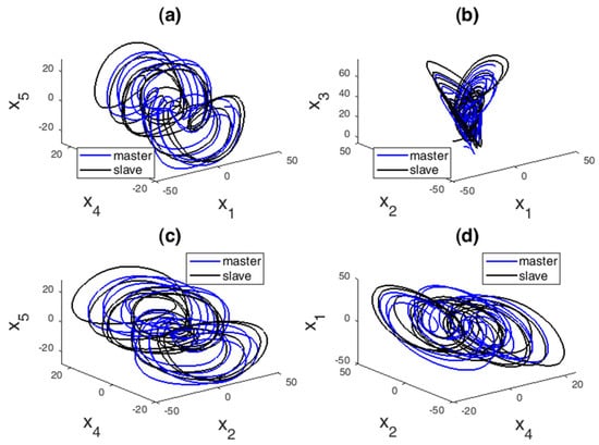 Three-dimensional phase portraits of the master system (43) with the initial conditions (44) and the slave system (47) with the initial conditions in the (a) plane, (b) plane, (c) plane, and (d) plane.