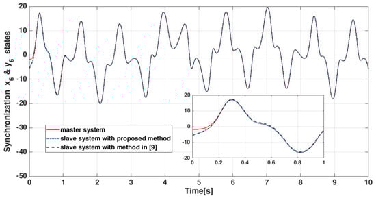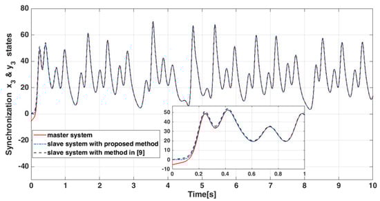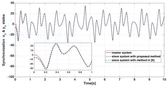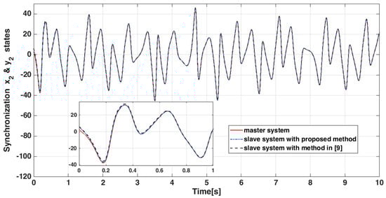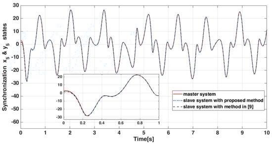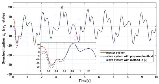 The state responses of the hyper-chaotic master-slave systems (43) and (47) compared to the method presented in [9], are shown from Figure 8, Figure 9, Figure 10, Figure 11, Figure 12 and Figure 13.