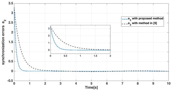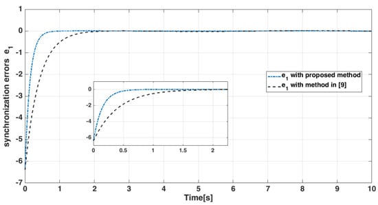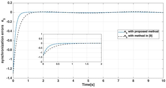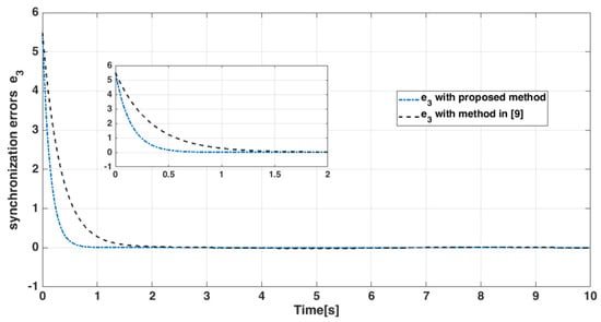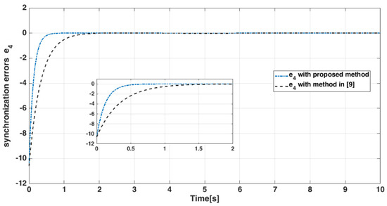 The state trajectories of the error dynamic systems compared to the method presented in [9], are shown from Figure 14, Figure 15, Figure 16, Figure 17, Figure 18 and Figure 19. According to the figures, it is obvious that the error system converges to the origin in finite time. Therefore, finite-time synchronization has occurred, and the proposed controller can eliminate uncertainties in a finite-time with better resistance.
