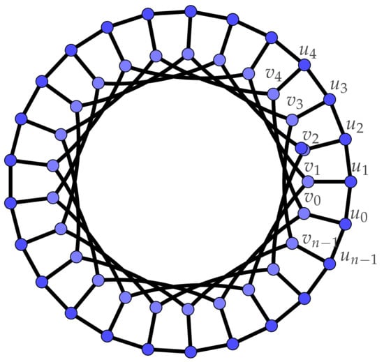 The generalized Petersen graph is a graph with vertex set and edge set , where , , , , , and subscripts are reduced modulo n, see Figure 1. Thus, we identify integers i and j iff . (As usual, means that , or equivalently, for some integer .