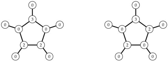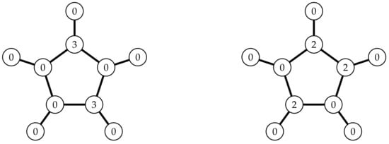 First, we recall the notion of covering graph and h-lift to observe that is a covering graph of both and . For basic information on covering graphs see []. Here we follow the approach used in []. Let and be two graphs, and let be a surjection. We will call p a covering map from H to G if for each , the restriction of p to the neighborhood of is a bijection onto the neighborhood of in G. In other words, p maps edges incident to v one-to-one onto edges incident to . H is called a covering graph, or a lift, of G if there exists a covering map from H to G. Assuming H is a lift of G with a covering map p. If p has a property that for every vertex , its fiber has exactly h elements, we call H a h-lift of G.