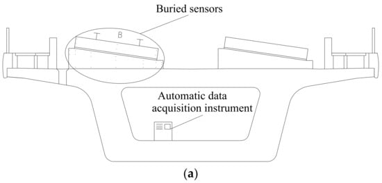 The joints of track slab near the fixed supports of simply supported beams are selected as the test section, and temperature sensors (28 in total) and data acquisition instruments are installed. In the observation scheme, 28 temperature sensors are embedded as shown in Figure 2.
