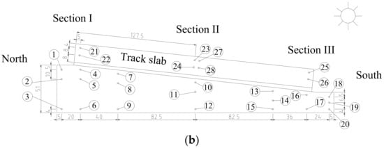 Schematic diagram of temperature sensor arrangement: (a) structural drawing of beam cross-section; (b) schematic diagram of 28 temperature sensors embedding in ballastless track.