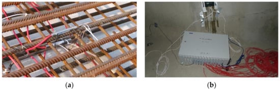 Burial site of temperature sensor: (a) binding condition of temperature sensor; (b) data acquisition instrument in box girder.