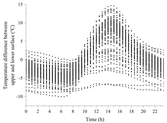 It can be seen from Figure 5 that the temperature difference between the upper and lower surfaces of the track can reach between −10 and 15 °C, and the greater the daily air temperature difference, the greater the vertical temperature difference of the track slab. The maximum positive temperature difference appeared at 15:00 p.m., and the maximum negative temperature difference appeared at about 6 a.m.