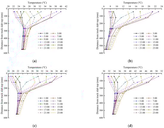 In order to further explore the temperature field distribution characteristics of ballast-less track structure, typical sunny days in four seasons of two test sites were selected respectively, and the daily vertical temperature variation diagram of Section II was drawn (Figure 6). Among them, 11 October (sunny weather, temperature 23–32 °C) is selected in autumn, 22 February (sunny weather, temperature 6–16 °C) is selected in winter, 10 April (sunny weather, temperature 17–28 °C) is selected in spring, and 30 July (sunny weather, temperature 27–36 °C) is selected in summer.