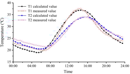 Taking the measured data of ballastless track temperature field as an example to verify the thermodynamic model of the ballastless track temperature field, temperature sensors are set in the wide and narrow joints of the track slab, where the measuring point T1 is 4 cm away from the upper surface of the track slab, and the measuring point T2 is 2 cm away from the lower surface of the track slab. The temperature record on October 5, 2013 is taken as an example to verify. The maximum temperature of the day is 27.6 °C, the minimum temperature is 18.1 °C, the average wind speed is 2.2 m/s and the atmospheric transparency coefficient is 0.85. The calculation results are shown in Figure 7.