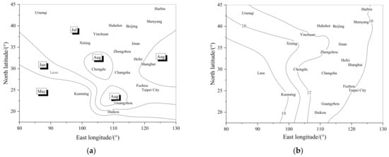 Through thermodynamic simulation analysis, the maximum positive temperature gradient and occurrence time of ballastless track are summarized in Figure 8. The maximum positive temperature gradient of ballastless track in China is 13:00–16:00 p.m. from May to August. The occurrence time of the maximum positive temperature gradient is related to latitude and longitude and local climate. Generally speaking, the month of the maximum positive temperature gradient appears earlier in the low latitude area, and time appears earlier in the eastern area.
