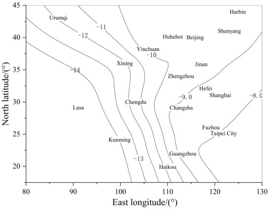 According to the thermodynamic simulation analysis, except that the maximum negative temperature gradient of Fuzhou ballastless track appears at 5:00 a.m. in February, other areas appear at 5:00–5:30 a.m. in January, and the lowest temperature on the surface of track slab in the western region appears slightly later than that in the eastern region. The distribution of the maximum negative temperature difference of ballastless track is shown in Figure 9.