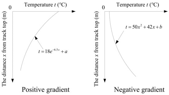 where the is the slab temperature at different depths between the track structure and the surface (°C), is positive temperature gradient, is negative temperature gradient; is the depth from the track slab surface (m); and () is the regional adjustment coefficient of the positive (negative) temperature gradient obtained by fitting (Table 1). The square of the correlation coefficients in the fitting results are all above 0.9, indicating that the fitting results are relatively reliable.