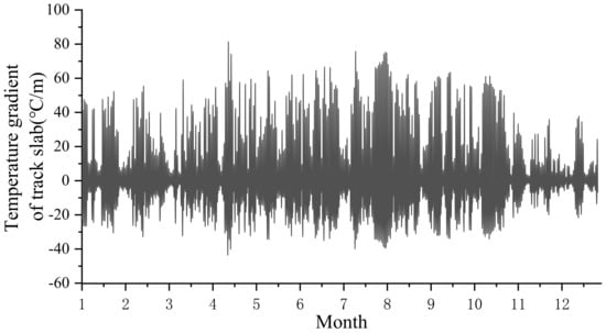 Taking the representative cities in China as an example, the maximum gradients of track slab in Harbin (north region), Nanchang (middle region) and Guangzhou (south region) throughout the year are shown in Table 2. Taking Nanchang as an example, the annual temperature gradient changes are shown in Figure 11.