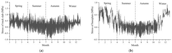 It can be seen from Figure 12 that due to the influence of temperature load, the track slab and baseplate are inclined to tensile stress in spring and winter, and to compressive stress in summer and autumn, and the temperature change of ballastless track will decrease with the increase of track structure depth. Therefore, for the ballastless track structure, the daily temperature gradient change of the track slab on the upper layer is greater than that of the baseplate on the lower layer, and the corresponding stress fluctuation amplitude and frequency of the track slab are also greater than that of the baseplate.