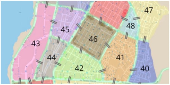 The final solution proposal is shown in Figure 2. It should be noted that some territories have a reduced number of basic units; for example, there is a territory with a single basic unit that corresponds to a zone with a strong presence of industries and offices, while other zones include a large number of basic units (zones with less population and/or economic activity). This disparity is logical and is due to the structure of the city considered in the case study.