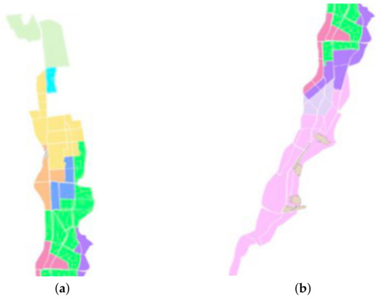 Divisions created in a zone of the city studied in the case study (figure (a) shows the north and central area, while figure (b) shows the central and south area). The territories are shown in different colors with the basic units delimited by white lines.