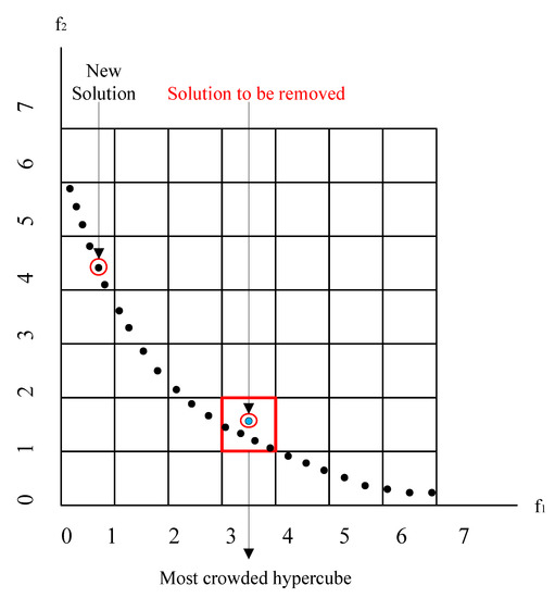 Practically, a well-suited size for the external archive is 100 bees. Figure 2 shows the concept of the selection and removal of the solution from the external archive, graphically explained in [44]. An objective space is divided into several hypercubes. If the external archive is full and a new nondominated solution is obtained, then the nondominated solution from the overcrowded hypercubes is randomly selected and deleted, as shown in Figure 2.
