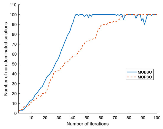 To verify the accuracy and reliability, the proposed MOBSO method was compared with the MOPSO method. Both methods were run 50 times with 500 iterations each time. Table 5 shows the GD obtained by the MOBSO and MOPSO methods. The GD obtained by MOBSO was lower than that obtained by MOPSO. That is, the solutions determined by MOBSO are closer to the solutions of the true Pareto optimal set than the solutions determined by the MOPSO method. Therefore, the accuracy of the proposed MOBSO method was higher than that of the MOPSO method. In addition, the 100 solutions are inserted in the external archive by the MOPSO method in 77 iterations, whereas MOBSO requires 42 iterations, as shown in Figure 6. The MOBSO method is, thus, faster than the MOPSO method.