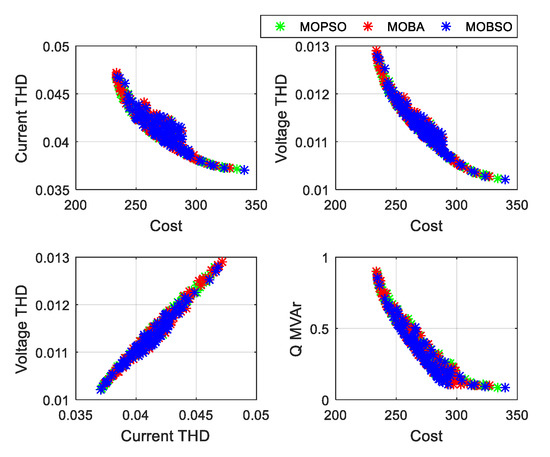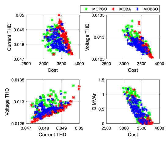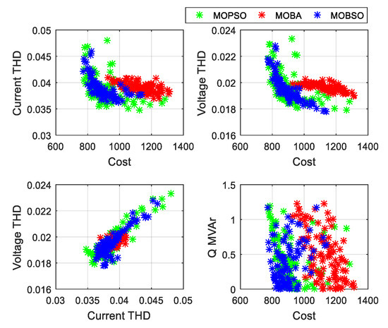 The MMD results select the final best solution among all the non-dominated solutions. Each method provides 100 solutions and merges them to select the balanced one out of 300 non-dominated solutions. The solution sequence was as follows: 1–100 (MOBSO), 100–200 (MOPSO), and 200–300 (MOBA). In each case, the sequence of the most balanced solutions obtained by the MMD lies between 1–100. The set of solutions was obtained using MOBSO, that is, the MMD results of MOBSO are better than those of MOPSO and MOBA. The Pareto front is obtained by the three algorithms (MOBSO, MOPSO, and MOBA) for each case with their respective topologies (see Figure 7, Figure 8 and Figure 9).