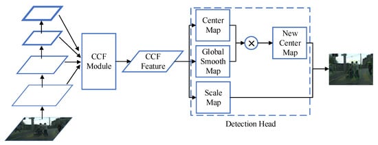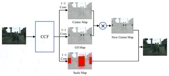 As shown in Figure 3, the detection head includes center map, global smooth map and scale map. They are all obtained by the feature map generated by CCF through different 1 × 1 convolutions. Then we use the global smooth map to modify the center map to obtain a more accurate new center map. Finally, the new center map and scale map are used to generate detection results. Optionally, the offset map can be added to the detection head to correct the position of the object.