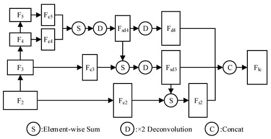 where means 4 × 4 deconvolution. will be used as the new source, and after dimensionality reduction of feature map will be fused to obtain according to Equation (1). will be used to transfer the semantic information and detailed information contained in the feature maps , and . (2) As mentioned before, in purpose (1), the semantic information of the deep feature map will continue to be lost, so the feature map needs to be transformed into a feature map of size for feature reuse (Equation (2)). can retain the feature representation in the deep feature map.