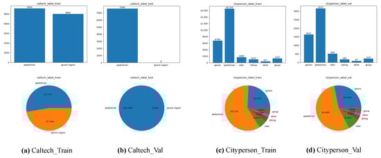 The histogram and pie chart represent the distribution statistics of each category in the Caltech and CityPersons datasets. (a) represents the label distribution of the training set in the Caltech dataset. (b) represents the label distribution of the test set in the Caltech dataset. (c) represents the label distribution of the training set in the CityPersons dataset. (d) represents the label distribution of the validation set in the CityPersons dataset.