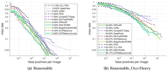 To evaluate the proposed CCFNet, we conducted comparative experiments on Caltech [,] and CityPersons []. In this section, we introduce the datasets and experimental setting, then verify the effectiveness of the model by the ablation study on the CityPersons dataset, and finally show the compare experimental results with state-of-the-art methods and visualize to verify the superiority of the CCFNet.