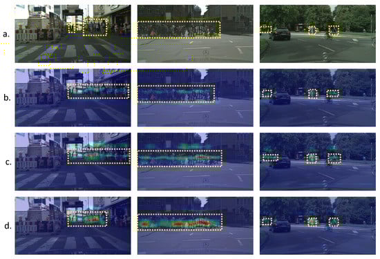 Visualization results of ACFPN, CSP, and CCFNet. (a) Input the original image for the CityPersons dataset; (b) is the visualization result of ACFPN; (c) is the visualization result of CSP; (d) is the visualization result of CCFNet.