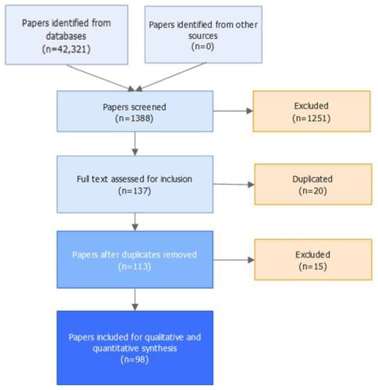 A total of 98 publications were included in the systematic review. The selection procedure was thorough, in order to ensure that only studies were examined that were relevant and of high quality. The CASP Systematic Review Checklist [], which addresses the assessment of research in systematic reviews, was used to manage the process of acquiring, selecting, and reviewing data for the review.