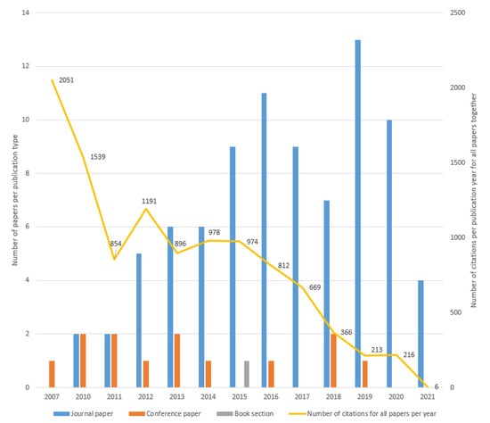 The search in the online digital libraries was conducted in August 2021. The search query was made as broad as possible, to consider as many results as possible related to the research questions posed in this systematic review. The procedure used for searching and the selection of publications are summarized in Figure 1. The summary of the results returned for each database search is presented in Table 1.