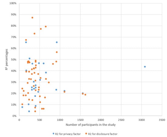 In this paper, we have searched for publications with statistical models containing both privacy and disclosure constructs. Most of the statistical models were structural equations models (SEM). The purpose of SEM is to assess model fit and test the hypotheses of the research []. SEM models are used in different areas, including financial operations, vaccination prediction and similar [,].
