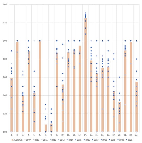 The authors of papers containing SEM should present what items they used to test each construct. Normally, each construct should have more items for testing the whole model. Next, it is important that the convergent validity of items is presented by measuring Cronbach’s alpha, composite reliability and average variance extracted measures. Cronbach’s alpha is a measure that tests to what extent multiple items for a construct belong together. Cronbach’s alpha coefficient ranges from 0 to 1, and the acceptable reliability coefficient is above 0.7; in some research, authors also discuss that a coefficient above 0.6 is sufficient [,]. Cronbach’s alpha is calculated for each construct in the model. Composite reliability is a measure of the internal consistency required in internally correlated latent variables, and its measure should be greater than 0.7 []. The average variance extracted measures the amount of variance captured by a construct in relation to the amount of variance due to measurement error, and it should be greater than 0.5 [,].